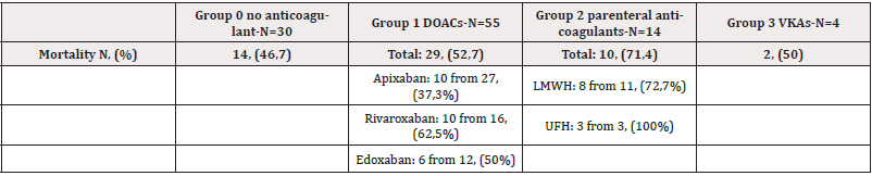 54 patients (52,4%) died during the follow-up. The mortality rate was highest in the group on UFH: 3 of 3 patients or 100% have died. Between the 4 groups, mortality was highest in the group 2 who were on parenteral anticoagulants-71,4%. In DOACs group, mortality was highest in patients on rivaroxaban and lowest in patients on apixaban. (Table 7). There is no statistical significance between the four groups regarding mortality (Table 8).