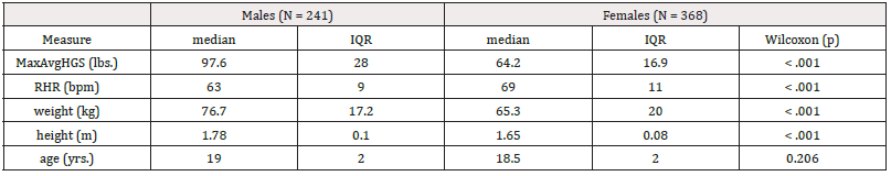 The data for this study were collected from 616 primarily firstyear college students, aged 18 years or older, enrolled in health and fitness classes during the Fall 2022 and Spring 2023 semesters. To maintain the focus on the traditional college-age demographic, we excluded 7 participants over the age of 26 from the dataset prior to conducting statistical analyses. This resulted in a final sample of 609 participants, aged between 18 to 26 years; median age 19 [22]. We performed additional analyses incorporating these participants to evaluate the impact of excluding these seven older individuals on our study’s outcomes. These analyses confirmed that their exclusion did not modify the study’s results in any way. The average characteristics of the sample were: age=19 years, height=1.7 meters, weight=72.4 kilograms, RHR=67 Beats Per Minute (BPM), and MaxAvgHGS=78.06 kilograms. For males, the averages were: age=19 years, height = 1.77 meters, weight=78.9 kilograms, RHR=64 BPM, and MaxAvgHGS=99.5 kilograms. For females, the averages were: age=19 years, height=1.64 meters, weight=68.1 kilograms, RHR=69 BPM, and MaxAvgHGS=64 kilograms. To investigate potential sexbased differences across various physiological and demographic variables, we divided the data into male (N=241; 39.6%) and female (N=368; 60.4%) groups. This approach was informed by insights from previous research [3] and the hypothesis that significant differences could exist between these groups across all study variables. RHR data were obtained from fitness trackers worn by all freshmen at the institution as part of their health and physical exercise requirements. All students are also required to enrol in a health and physical exercise course every semester. HGS scores were recorded during strength training class labs. Participants provided informed consent for all data collected, and the results were explained as part of the class content.