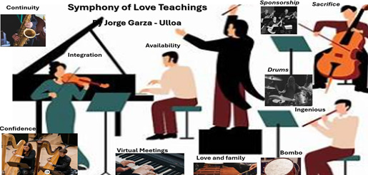 This story is based on real events and personal experiences with a family member who had, by nature, that gift of guiding people in the right direction. They are always open to helping, listening, and guiding us through the years at every stage of our lives; they earned the inspirational gift of being composers of “symphonies of love teachings.” Where “symphony” is an extensive and complex musical composition for the harmony of many musicians with different instruments, achieving harmonious and amazing results. Relating each positive teaching learned with the learning of a musical instrument, which, by accumulating them, we form a unique, personalized orchestra, where we can create compositions with others to obtain the “symphonies of love teachings.”