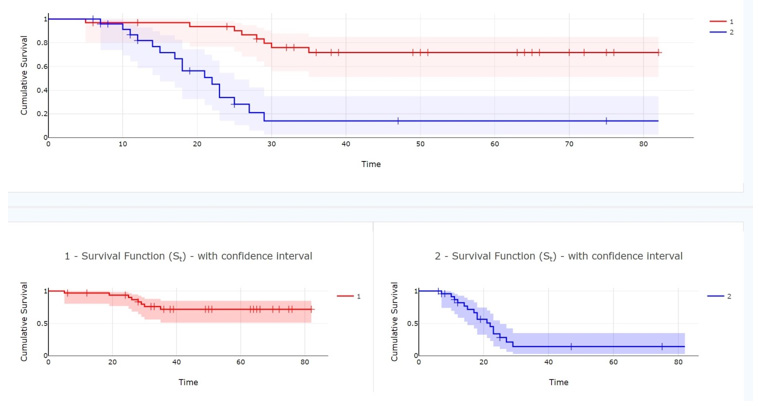 Figure 1: The relationship between survival times of patients with Oral Squamous Cell Carcinoma and neutrophil-to-lymphocyte ratio in peripheral blood (NLR). number 1 (red line): high NLR, number 2 (blue line): low NLR.