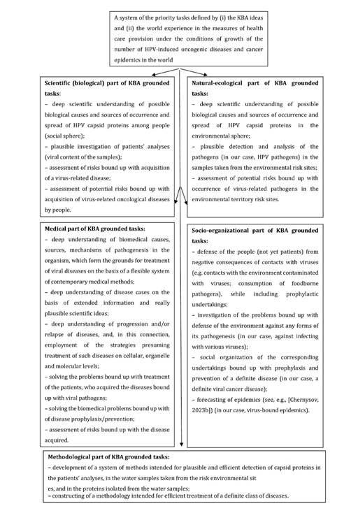 The author’s KB-approach is oriented to bringing the researcher closer to understanding of (i) Negative Global Tendencies (NGTs) bound up with the growth of the diversity of diseases; (ii) Global consequences of above NGTs expressed in the form of Negative Social Health Level Tendencies (NSHLTs), which may be bound up with the growth of the number and the diversity of various diseases. An approach within the frames of the KB-ideology stimulates the researcher to move on and (iii) Ascertain important practical tasks considered to be urgent in connection with the disease problem (Figure 5) (these are various tasks bound up with possible undertakings of the specialists directed not simply to prophylaxis, prevention, treatment undertakings, but to refinement of the health care system); (iv) Formulate a system of global priority tasks (for the specialists) bound up with possible undertakings considered as urgent (Figure 6); (v) Formulate a system of global practical tasks (of the health care system) bound up with possible undertakings considered to be urgent (Figure 7); (vi) Formulate a system of priority tasks in the measures of health surveillance (the set of such measures has been complemented on the basis of the world experience in the measures of health surveillance) (Figure 8). The KB-ideology is oriented not only to practicing medical doctors but to the researchers involved in solving global health-care and health-surveillance problems.