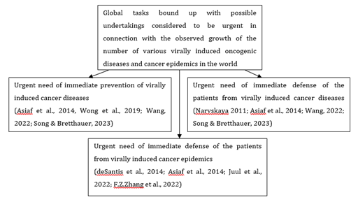 As noted above, the issues, which are usually considered in medical articles of numerous authors writing about the problem of treatment of hazardous (e.g. oncogenic and viral) diseases (especially heavy forms of such diseases as Viral Diseases (VDs) and Virus-Induced Diseases (VIDs)) and about health care problems in principle, are normally reduced to consideration of the following traditional and very practically important aspects bound up with treatment: improved forms of analyses; practice of application of some new medication, which have appeared to date; unusual treatment techniques, etc. The material of the present publication is based on the author’s clinical experience and his scientific (physiological and psychological) findings. So, the conclusions have been supported by numerous results of clinical treatment processes and scientific investigations. This basis has supported by the author’s idea of KB-ideology, which has formed a complement for the grounds for some principally new attitude to problems of public health. The aspect of the KB-ideology has led to reconsideration of some objectives bound up with health care and health surveillance.