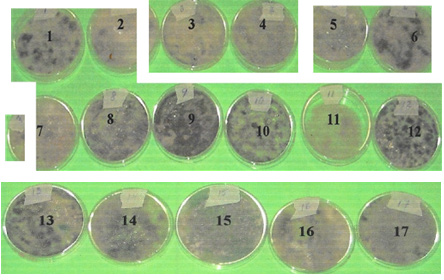 Identification of various fungi was made based on their growth, colour of mycelium, and conidial head and conidia and are presented in Table 3. Table 4 on the types and number of fungal colonies exhibit interesting observations. The distribution of these fungi varies with soil types. Probably, it depends on the nutrient content of different soil types. Trichoderma harzianum is interestingly dominant in soil types 3,11,13, and 14. Similarly, A. niger dominates in soil types 6, 7, 8, 9, 1 and 2. Radial growth of mycelium of A. flavus, A. niger, T. harzianum, T.roseum on PDABM for seven days at room-temperature are presented in Table 5.
