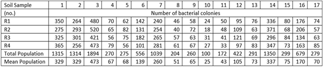 Soil microorganisms have been screened using seventeen soil samples collected from different places in Guyana. Through serial dilution of seventeen different soil samples, two separate observations were made for bacterial arid fungal colonies. The results are presented in Tables 1 and 2 and Figures 1 and 2.