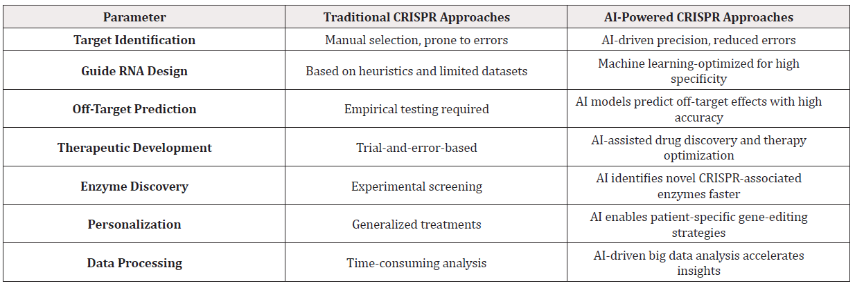 Additionally, AI-driven analyses have facilitated the discovery of novel CRISPR-associated proteins, expanding the toolkit available for genetic manipulation. For instance, researchers have employed reinforcement learning models to identify new CRISPR enzymes with improved efficiency and reduced off-target effects [13]. Furthermore, AI models have been used to predict gene expression changes following CRISPR interventions, enhancing our understanding of gene regulatory networks [14]. Moreover, AI’s role in optimizing CRISPR-based therapeutics has been underscored in recent studies focusing on precision medicine. AI algorithms have been employed to analyze patient-specific genomic data, allowing for the design of personalized CRISPR therapies targeting genetic disorders like sickle cell anemia and cystic fibrosis [15]. Table 1 shows comparative study of traditional CRISPR approaches and AI-powered CRISPR methodologies across various parameters.