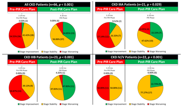Upper Left: The upper left pair of charts show all patients in the study (n=66, p<0.001). The fraction of patients worsening in their CKD stage has decreased from 46.97% to 10.61%. The fraction of patients remaining stable has increased slightly from 50% to 54.55%, and the fraction of patients improving from 3.03% to 34.85%. Upper Right: This pair of charts shows only the patients in the cohort that began treatment as CKD stage IIIA (n=21, p=0.02). In this cohort, the fraction of patients worsening decreased from 57.14% to 19.05% and patients improving increased from 9.52% to 33.33%. Stable patients Increased from 33.33% to 47.62%. Lower Left: This pair of charts shows the patients at start of treatment with CKD Stage IIIB (n=23, p<0.001). No patients showed improvement pre-PIR, which increased to 47.83% improving while on PIR. Conversely, the fraction of patients worsening decreased from 56.52% to 4.35%. The fraction of stable patients increased from 39.13% to 47.83%. Lower Right: This graph shows the cohort of CKD IV and V patients followed in the study (n=22, p<0.001). Prior to PIR, no patients were improving, which increased to 22.73% improving after PIR. 50% of patients were worsening, while no patients were worsening while on PIR. Worsening was defined, for CKD V patients, as transitioning to active dialysis, as there are no further CKD stages beyond stage V. Finally, the number of patients remaining stable increased from 50% before PIR to 72.73% after PIR.
