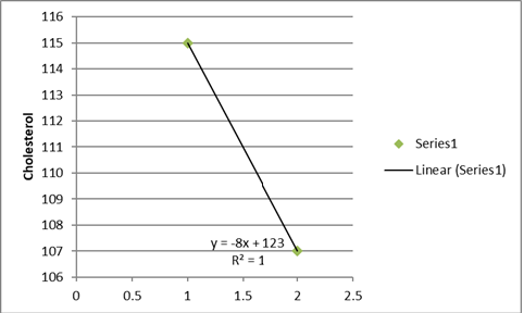 It was found that there is a strong correlation between a diet with wheat-derived foods and total cholesterol levels in the blood. It was observed that when this food group is excluded from the diet, total cholesterol levels in the body fall drastically. The coefficient of determination shows us that this correlation is 100%, so it is correct to state that if this food group is excluded, there will certainly be a regression in total cholesterol levels (Graph 3).