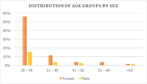 Figure 1: Distribution of age groups by sex, age group in years on the X axis, and percentage representation of the age group in relation to the total participants on the Y axis.