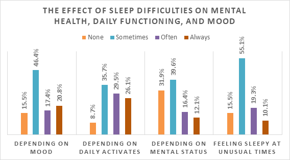 The repercussions of sleep difficulties on various aspects of individuals’ lives were notably significant among participants. Specifically, 38.2% reported a direct connection between their sleep challenges and mood disturbances, indicating that insufficient or poor-quality sleep may exacerbate feelings of irritability or emotional instability.