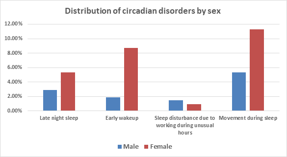 Table 3 and Figure 11 provide a comprehensive overview of the distribution of circadian disorders among participants, categorized by sex. This data underscores the importance of recognizing and addressing circadian disorders to promote healthier sleep patterns and improve quality of life.