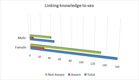 Figure 4: Linking knowledge to sex, the total number of people of both sexes (blue), the number of people who have never heard of the biological clock (red), the number of people who have previously heard of the biological clock (green).