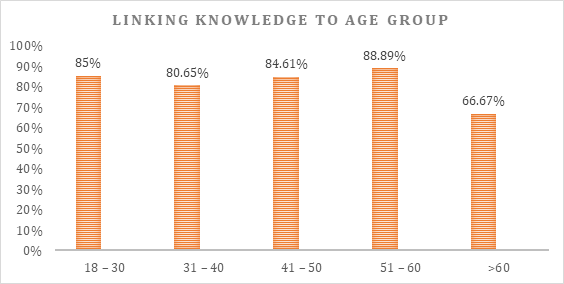 When examining knowledge across different age groups, the results further elucidate variations in awareness. Among participants aged 18 to 30 years, 85.13% reported knowledge of the biological clock, indicating a strong recognition in this younger demographic. The 31 to 40-year age group showed a slightly lower awareness at 80.65%. Participants aged 41 to 50 years demonstrated an awareness level of 84.61%, while those in the 51 to 60 age brackets had an even higher recognition rate of 88.89%. However, awareness significantly decreased in participants over 60 years of age, with only 66.67% acknowledging familiarity with the biological clock, as shown in Figure 5.