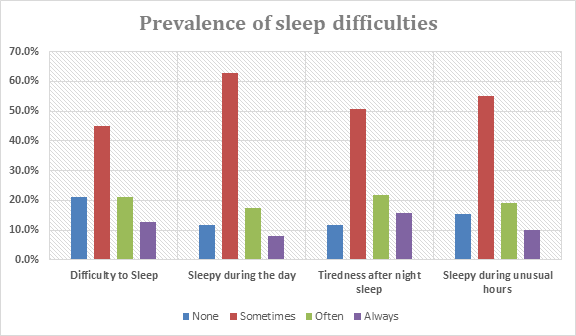 To gain insights into participants’ sleep behaviours, the questionnaire examined circadian patterns and sleep habits, providing data on sleep duration, consistency, and variations across weekdays and weekends. Additionally, the survey addressed the prevalence of sleep difficulties, capturing the frequency and types of sleep disturbances experienced by participants.