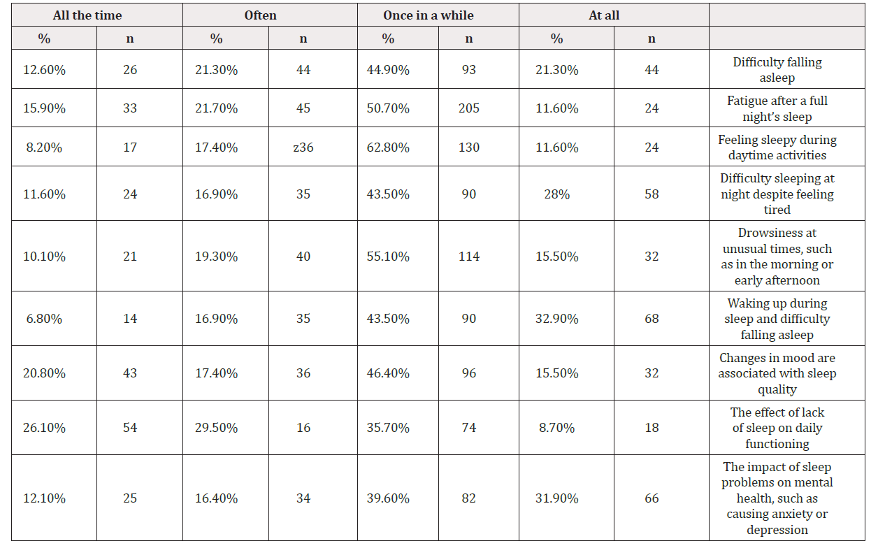 Figure 8 visually represents the prevalence of these various sleep difficulties among the participants, providing a clearer understanding of the scope and nature of sleep-related challenges faced by this population. This data underscores the need for targeted interventions to address these common sleep issues and improve overall sleep quality and health (Table 2).
