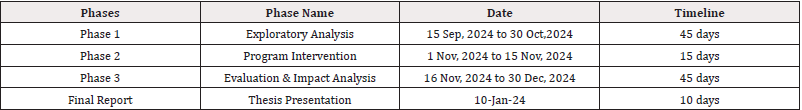 The research was carried out in three and half months. The data collection for phase one was initiated on 15th of September, 2024 and carried for 45 days till 30 October, 2024. The Intervention phase had a span of 15 days and then the final phase continued from 15 November 2024 to 30 December (Table 1).