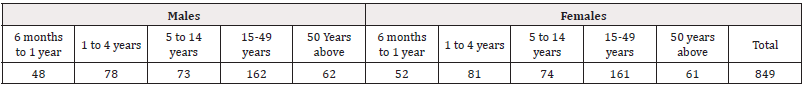This deals with analysing the epidemiology of RTIs in different villages under the surveillance of the basic health unit. The quantitative sub-component of phase 1 focuses on collecting data about the prevalence of infectious diseases and their segregation according to age and gender. Data is collected from the general out-patient department of the BHU and the number of patients presented with a particular disease is recorded along with the name of their village or vicinity. This provided the researchers with an opportunity to draw the estimated distribution of particular diseases, their endemicity and infectivity. The Respiratory Tract Infections reported from 15 Sep, 2024 to 30 Oct can be tabulated according to age and gender distribution as shown (Table 2).
