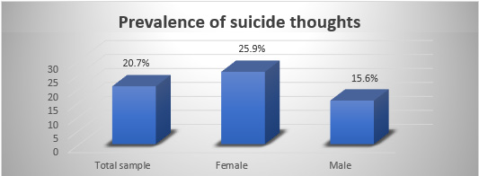 The study revealed that 16% of samples studied had a history of psychological disorder, 37% were in severe emotional stress (losing someone loved), 6% had history of physical disability, 16% had economic problems, 15% had social problem, 23% had losing hope for the future. History of violence (any type) was shown in 8% of studied sample, 4% had sedatives drugs addiction history, 8% had a family history of psychological disorder and 5% had a family history of suicide (Table 2). The prevalence of suicide thoughts among the total studied sample was 20.7%, for female was 25.9% and for male was 15.6% (Figure 1).