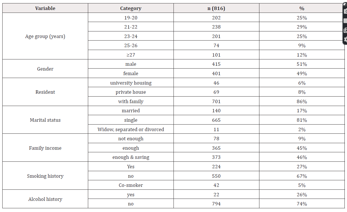 The male was represented 51% of studied sample, the highest percentage of participants (29%) was among (21-22year) age group and the lowest percentage (9%) was among (25-26 years). Most of the participants (86%) were living with their families, 8% were living in private houses, and only 6% of them live in university housing. For the current marital and economic status of the sample studied, the study registered 81% were single, 17% were married, while 2% were widows or divorced. The participants that had enough family income and savings from it were 46% of samples studied, 45% had enough income, and 9% had not enough income. Regarding the habits practiced (smoking, alcohol drinking), the study revealed that 27% of the participants were smokers, 67% were non-smokers, and the co-smokers were 5%. The alcohol drinking participants were 26% while 74% not drinkers (Table 1).