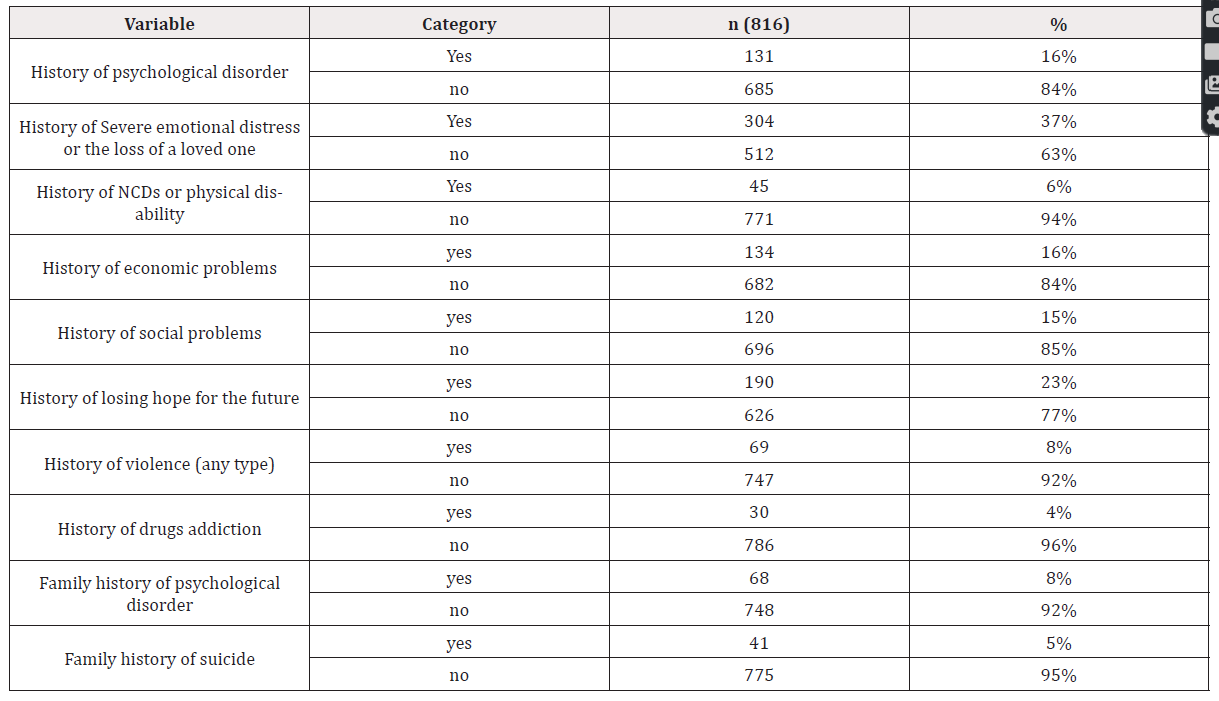 Table 2: Distribution of the study sample by suicide risk factors Variable.