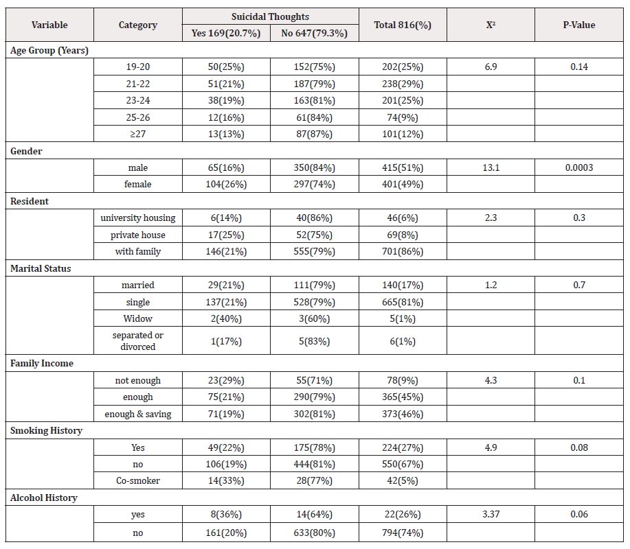 By designing a Kobo-collect form in the English language which contains several variables: demographics, monthly income, health habits, as well as the measurement tools applied were Beck Scale for Suicide Ideation (BSSI) the Scores will be calculated from four questions, where the participant has be considered having suicidal tendencies if the total score is greater than 7 ,and has no suicidal tendencies if the total score is equal or less than 7.To determine the association between (the outcome )suicidal thoughts among university students and the (exposure) risk factors we did statistical tests to calculate the chi-square and P-value if the P-value is less than 0.05 than the risk factor considered having statistically significant association with outcome. Then further analysis was done for all the variables with significant P-values enrolled in logistic regression to eliminate confounders and determine the strength of association by calculating log odds. Data analysis was done by MS. Excel 2019, SPSS & epi info7 programs. Data was presented as frequency tables.