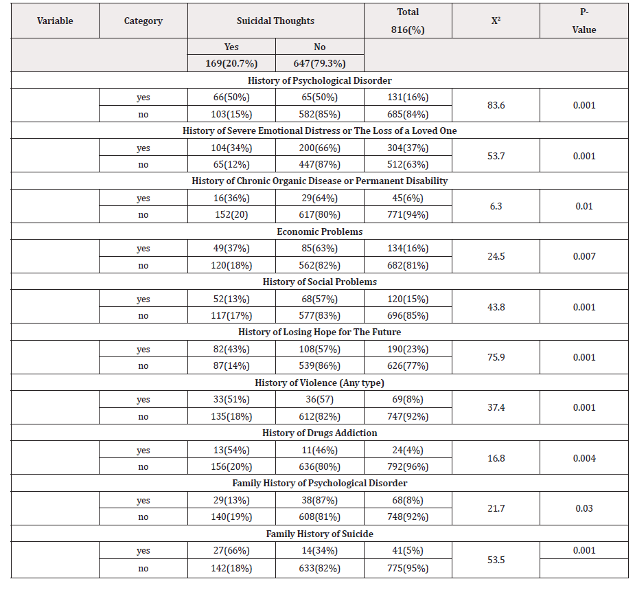 The Association of Suicidal Thoughts by Risk Factors Among Studied Sample