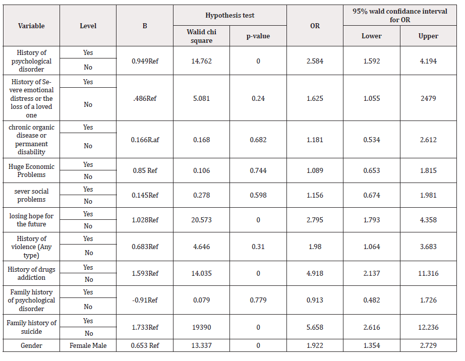 As shown in Table 4 10 risk factors were enrolled in chi square test; The suicidal thoughts were statistically significant association with the participants that had all the 10 factors as following: psychological disorders history (P=0.001), history of severe emotional stress (P=001), history of chronic organic disease or physical disability (P=0.01), history of economic problems (P=0.007), history of social problems (P=001), history of losing hope for the future (P=001), history of violence for any type (P=0.001), history of drugs addiction (P=0.004), family history of psychological disorders (P=0.03, and family history of suicide (P=0.001). Further analysis was done in order to eliminate confounders and calculate the strength and direction of association, 11 significant factors enrolled in (Generalized multi linear regression model) from those factors only 7 risk factors shown significant association with suicidal thoughts outcome (Table 4) shows the result of Generalized Linear Model using the multiple ordinal logistic regression for eleventh variables that showed significant statistical association with the suicidal thoughts from the chi square test. The results of Binary logistic models revealed that seven variables still have significant statistical association with the suicidal thoughts as shown by the P-Value <=0.05 and C.I at 95%. Only chronic organic diseases, huge economic problems ,sever social problems ,family history of psychological disorders was not a significant predictor as shown by the P-Value=0.682,0.744,0.598 and 0.779 respectively , Having a positive history of emotional stress or loss loved one was a significant positive predictor of suicidal thoughts , the log odds of having suicidal thoughts was 0.48 points higher on average for those who had a negative past history of emotional stress or loss loved one , the odds of having a positive past history of emotional stress or loss loved one having suicidal thoughts was 1.6 times that of those who had a negative past history of emotional stress or loss loved one.