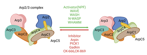 The left side illustrates the inactive conformation, where Arp2 and Arp3 are spaced far apart. The right side shows the active conformation, where the ARP2/3 complex rearranges upon activation, allowing it to bind to the sides of actin filaments. This conformation enables the ARP2/3 complex to recruit actin monomers, initiating the assembly and growth of new actin filaments from the sides of existing ones. The regulatory factors are indicated above and below the arrows. CK-666 and CK-869 are two small-molecule inhibitors that activate the ARP2/3 complex [6].