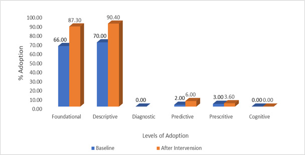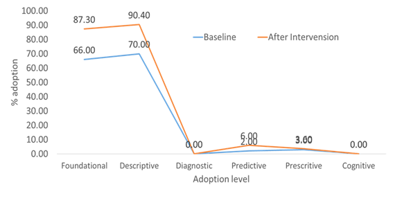 Figure 2 illustrates the levels of data analytics adoptions implemented in the counties, revealing that 90% of the analytics used were descriptive-a notable increase from 70% observed during the baseline assessment. The foundational adoption level saw a significant rise of 21%, climbing from 66% at baseline to 87% following the intervention. Furthermore, 6% of participants adopted predictive analytics, an increase from 2% previously, while 4% engaged in prescriptive analytics to guide optimal strategies in maternal health programming. Detailed descriptions of each level are presented in Figure 2 below.
