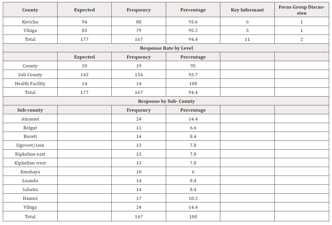 a) Kericho: Out of 94 expected respondents, 88 participated, resulting in a response rate of 93.6%. This included 6 key informant interviews and 1 focus group discussion. b) Vihiga: Out of 83 expected respondents, 79 participated, yielding a response rate of 95.2%, which comprised 5 key informant interviews and 1 focus group discussion see in table 2.