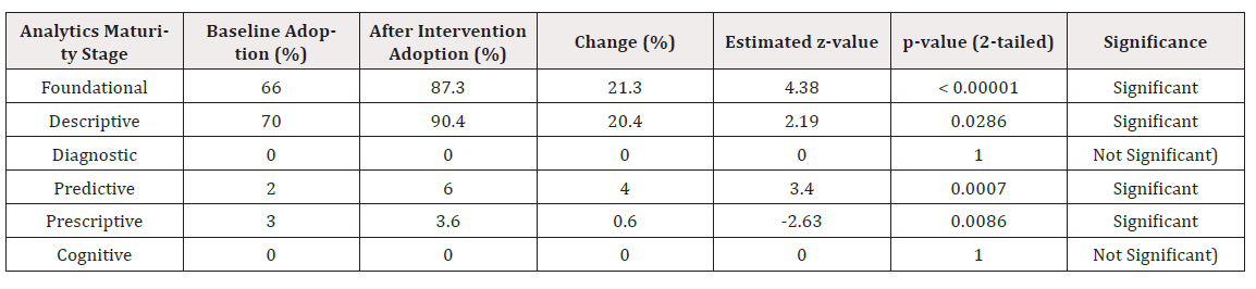 The results in Table 3 show that the intervention had statistically significant effects on most maturity stages. Foundational, Descriptive, Predictive, and Prescriptive show significant changes. On the other hand, the Cognitive stage and Diagnostic stages remain unchanged and statistically insignificant.