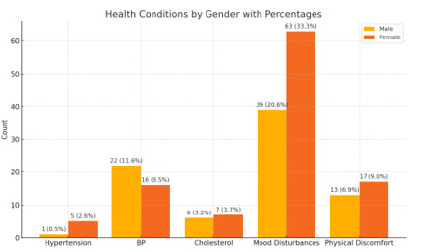The study highlights a significant prevalence of sleep disorders, mental health concerns, and lifestyle-induced physical health issues in urban working professionals. Women exhibited higher instances of mood disturbances (70.8%), anxiety (65 cases), and insomnia (over 50% of reported cases), whereas men showed higher rates of hypertension (24.7%). The presence of chronic sleep disorders such as insomnia (26.25%), nightmares (25%), and restless leg syndrome (14.25%) among both genders indicates a pressing need for awareness campaigns on sleep hygiene.