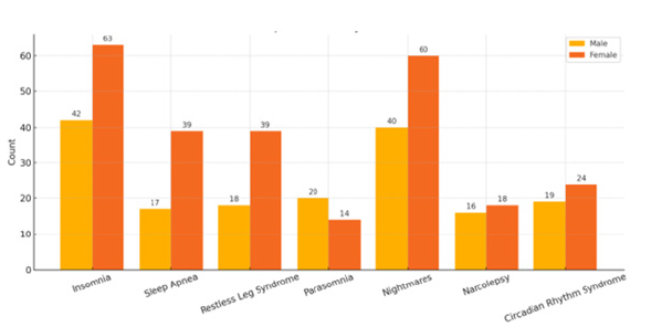 a. Insomnia and nightmares were the most prevalent sleep disorders among both males and females, with females exhibiting a higher prevalence. The higher occurrence of insomnia in females aligns with existing research that associates hormonal changes, caregiving roles, and increased stress with disturbed sleep patterns [19].