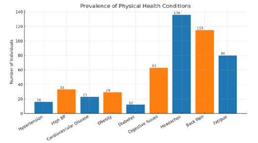 a. Physical Health: Hypertension was reported in 16 individuals, high blood pressure in 33, and cardiovascular disease in 23.