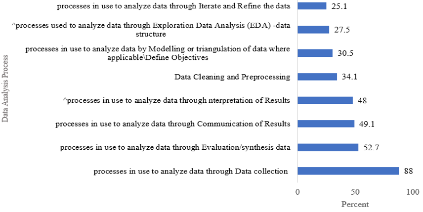 Figure 2 below demonstrates the various data analytics processes with 88 Percent of them happening during data collection. Slightly more than half (53 Percent) are during the synthesis of data and 49 percent of the process and 48 percent were during the communication and interpretation of the results respectively. Less than one-third 30 percent of the processes were realized during Modelling and exploration of data analytics.