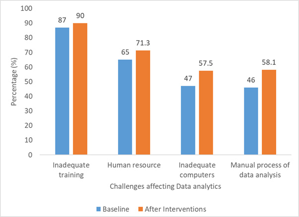 The main challenges affecting data analytics are inadequate training (90 percent), inadequate Human resources (71 percent), manual processing of data analysis and inadequate computers (58 percent) respectively as shown in Figure 3.