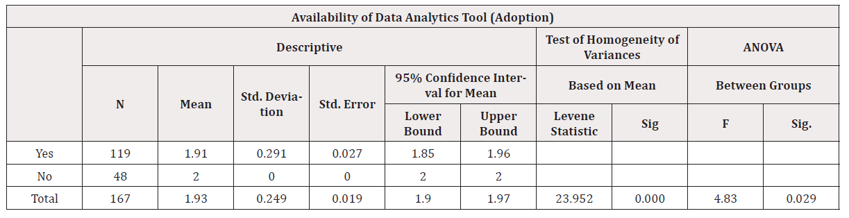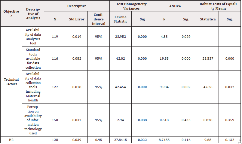 The analysis demonstrated that the availability of data analytics tools was statistically significant. Specifically, the adoption of data analytics was significantly associated with the availability of data collection tools, as evidenced by a Levene’s test statistic of 23.952 and an ANOVA F-test of 4.830, both with p-values less than 0.05. Similarly, the presence of standard data collection tools showed significant correlation, with Levene’s statistic of 42.02, an ANOVA F-test of 19.510, and a robust mean equality test of 23.537, all statistically significant at p<0.05. The availability of data collection tools in maternal health also correlated positively with statistical significance, with Levene’s statistic of 42.454, an F-test of 9.984, and a mean equality test of 4.626, all below the 0.05 threshold. Conversely, the availability of information technology did not show a significant effect, with Levene’s statistic of 2.940, an F-test of 0.618, and a mean test of 0.878, all above the 0.05 level.