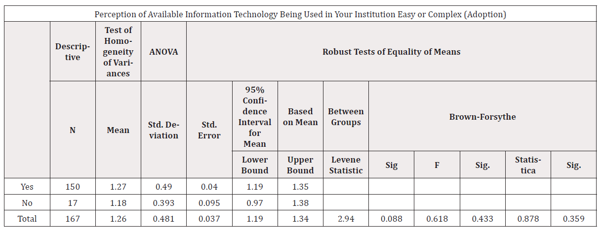 The findings indicate that perceptions of the ease or complexity of using information technology in institutions are generally similar among respondents, with both groups rating the IT use as relatively easy or simple. The mean scores are 1.27 for those who perceive IT as easy and 1.18 for those who see it as complex, with an overall mean of 1.26. Statistical tests, including ANOVA and robust analyses, show no significant difference between the groups (F=0.618, p=0.359; Brown-Forsythe F=0.878, p=0.433), suggesting a consensus that information technology is generally perceived as accessible and manageable in the institutions. See Table 10 below.