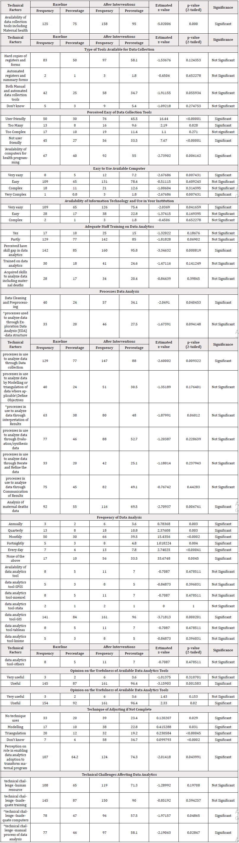 About three quarters (75%), had availability of information communication technology ease use in the institutions of health managers up from 65% with a z-value of -2.04 p-vale of 0.041659 at p<0.05 which was statistically significant but majority of the staff (85%) up from 77% were partially trained in data analytics with a z-value of -1.82 and p-value of 0.069020 suggesting that it was not statistically significant at p<0.05. Moreover, the perceived skilled gaps in data analytics increased by slightly more than 10% from 85% during baseline to 96% after the intervention with z-value of -3.35 and p-value of 0.000819 which was statically significant. The proportion of healthcare managers’ analysis of maternal deaths data increased from 55% during baseline to 70% after the intervention and done monthly by 40% of the healthcare managers.