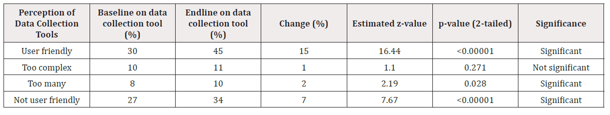 Table 3 reveals that there was a statistically significant and substantial increase in the proportion of respondents who found the data collection tools user-friendly, rising from 30% at baseline to 45% at endline. This sharp increase suggests that the intervention likely succeeded in making the tools more intuitive or in enhancing user capacity through training or support mechanisms. The very low p-value confirms that this improvement is unlikely to be due to chance. Further, there was also a significant increase in the proportion of respondents who perceived the tools as not user friendly (from 27% to 34%). This may indicate a polarization of perceptions. While some users became more comfortable with the tools, others may have faced persistent or new challenges-such as interface issues, language barriers, or lack of technical support—leading to greater dissatisfaction. This highlights the heterogeneous impact of the intervention, where improvements were not evenly felt. Moreover, there was a statistically significant increase that was observed in the perception that the data collection tools were too many (from 8% to 10%). This might reflect a growing awareness or exposure to multiple tools post-intervention. While it may suggest increased comprehensiveness of data collection, it also raises concerns about tool overload and the need for integration or simplification. However, the change in the perception that the tools were too complex (from 10% to 11%) was not statistically significant. This indicates that complexity remains a relatively stable concern, unaffected by the intervention. While it is a relatively minor category, this consistency implies that no substantial improvements were made in simplifying tool design or enhancing user understanding.