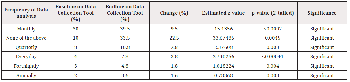 The results in Table 4 reveal that the intervention appears to have increased the overall frequency and diversity of data analysis routines, especially in favor of Monthly, Quarterly and daily practices. However, the sharp increase in the “None of the above” category might indicate gaps in clarity, structure, or adherence to standard routines. The findings suggest both progress and complexity: while regular analysis is improving, some users may still operate outside standard reporting frequencies.