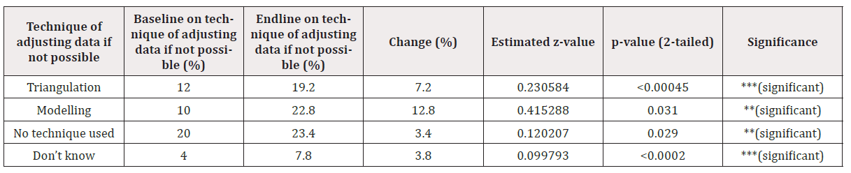The results in Table 5 show that there were significant increases in the use of triangulation and modelling are positive indicators that the intervention enhanced technical capacity for managing incomplete data. However, the rise in “no technique used” and “don’t know” also suggests that some gaps remain, particularly in the dissemination or retention of skills among all participants. Targeted follow-up training or mentoring might help reduce reliance on no-strategy approaches and support those who are still uncertain.