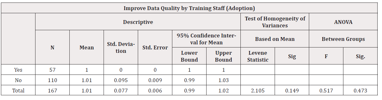 Technically, the training of health managers does not suggest improvement in data quality. Test of homogeneity of variance at 95% confidence interval and standard error of 0.006 demonstrated Levene statistic of 2.105 with a significant level of 0.149 which was greater than P<0.05 and ANOVA F-test was 0.517 with a significant level of 0.473 which was above P<0.05 suggesting that it was not significant as denoted in Table 7 below.