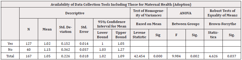 The findings show that the availability of data collection tools, including those for maternal health, varies among respondents, with those having access reporting a mean score of 1.02, indicating higher adoption. Respondents without access had a higher mean score of 1.15, suggesting lower adoption. The ANOVA and robust tests of equality of means reveal a significant difference between the groups (F=9.984, p=0.002; Brown-Forsythe F=4.626, p=0.037), indicating variability in the availability and adoption of data collection tools. While many respondents have access to these tools, a notable proportion lack such resources, highlighting the need to improve the availability of maternal health data collection tools. See Table 8 below.