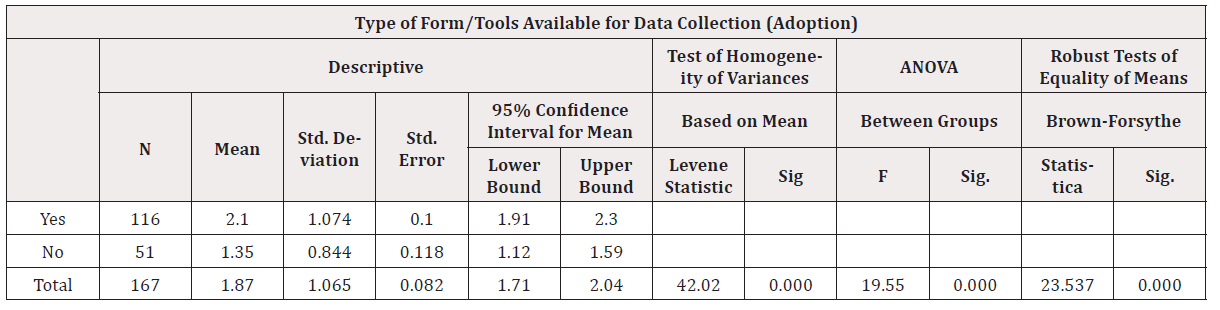 The results indicate that the type of data collection forms or tools available for use varies significantly among respondents, with those having access reporting a higher mean score of 2.1, suggesting greater adoption of diverse forms and tools. Conversely, respondents without access had a lower mean score of 1.35, indicating limited use. The ANOVA and robust tests reveal a highly significant difference between the two groups (F=19.550, p=0.000; Brown-Forsythe F=23.537, p=0.000), highlighting substantial variability in the availability and adoption of data collection forms and tools. Overall, while many respondents have access to various forms for data collection, a considerable proportion lack such resources, underscoring the need to enhance the availability and utilization of appropriate data collection tools. See Table 9 below.