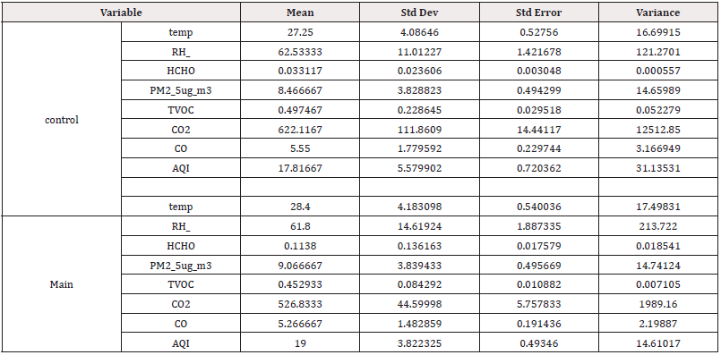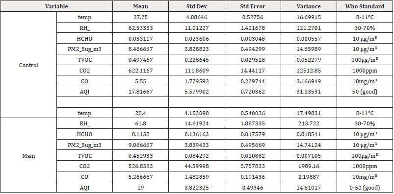 The study compared the ambient concentrations of selected air pollutants between control values and initial measurements taken within the abattoir (See Table 1) The mean temperature in the abattoir was 28.4°C, slightly higher than the control value of 27.25°C. The standard deviation was similar for both (4.18 for the abattoir and 4.09 for the control), indicating comparable variability in temperature. The standard error was 0.54 in the abattoir and 0.53 in the control, while the variance was 17.50 in the abattoir compared to 16.70 in the control. This suggests a marginal increase in temperature within the abattoir environment, likely due to ongoing activities that generate heat, with only slight differences in variability and precision.