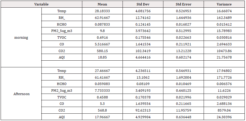 The AQI was slightly higher in the morning (18.85) compared to the afternoon (17.97). The morning measurements had a standard deviation of 4.66, while the afternoon had a higher standard deviation of 4.93. The variance was also higher in the afternoon, indicating more fluctuation in overall air quality during this period (Table 2,3).
