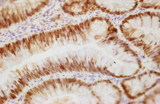 Figure 10: Photomicrograph of Adenomatous polyp Cyclin D1expression: Positive (Case No: 15, IHC X 40x).