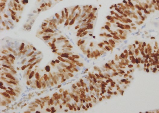 Figure 12: Photomicrograph of Adenomatous polyp Ki-67 expression: Positive (Case No: 48, IHC X 40x).