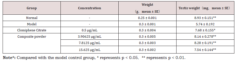 Following the induction period, the cyclophosphamide was withdrawn. The positive control drugs and the composite powder were administered via aqueous solution. The following endpoints were measured: (1) body weight and testis weight; (2) frequency of rear-end collisions; (3) sperm count using a hemocytometer; and (4) serum levels of testosterone, follicle-stimulating hormone (FSH), and luteinizing hormone (LH) using commercial enzymelinked immunosorbent assay (ELISA) kits.