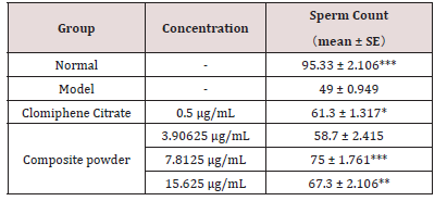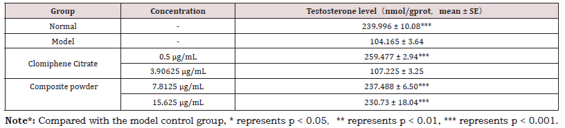 Furthermore, the composite powder exhibited a potent effect on the endocrine axis. Testosterone levels, which were drastically lowered in the model group, were restored to near-normal levels following treatment with the medium and high concentrations of the composite powder (Table 4). The calculated improvement in testosterone content was 98.15% and 93.18% for these two concentrations, respectively, indicating a strong androgen-boosting capacity (Table 1-4).